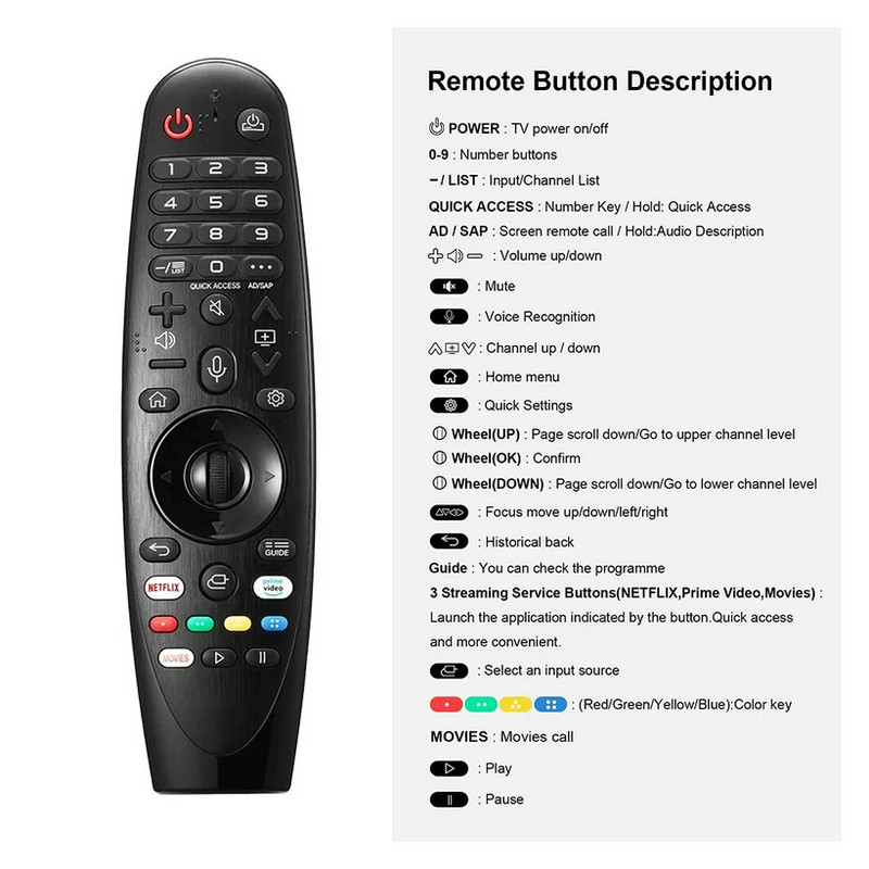 راهنمای اتصال کنترل جادویی تلویزیون LG لازم است باتری کنترل نو باشد. مصرف باتری این کنترلها بالاست و در صورتی که عمل نمیکند، امکان دارد باتری تمام شده باشد. میدان مغناطیسی اطراف دستگاه همانند امواج WiFi، مایکروویو، لامپ هالوژن و ... میتواند عملکرد کنترل جادویی را مختل کند. تلویزیون را روشن کنید. پس از ۲۰ ثانیه، کنترل را به سمت تلویزیون گرفته و سپس دکمه (OK) را فشار دهید. کنترل از راه دور به طور خودکار ثبت میشود، و پیام کامل شدن جفت سازی در تلویزیون نمایش داده میشود. چرا کنترل جادویی ال جی کار نمی کند؟ لازم است یک مرتبه نیز UNpair و pair ( یعنی غیر فعال و فعال سازی ) کنترل تلویزیون انجام شود. برای غیرفعال کردن کنترل تلویزیون های ال جی در این مدل شکل زیر عمل کنید