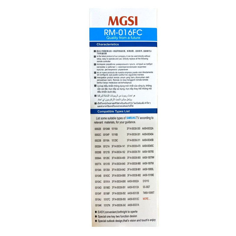 کنترل سامسونگ MGSI SAMSUNG RM-016FC محصولی از شرکت MGSI دارای آی سی اصلی و جنس بدنه شفاف و مقاوم که در اثر ضربه مقاومت بسیار فوقالعاده ای دارد و داخل بسته بندی شیک و امنی است. لطفا این ریموت را فقط باجعبه شرکتی MGSI که در عکسهای معرفی کالا نشان داده شده تحویل بگیرید.